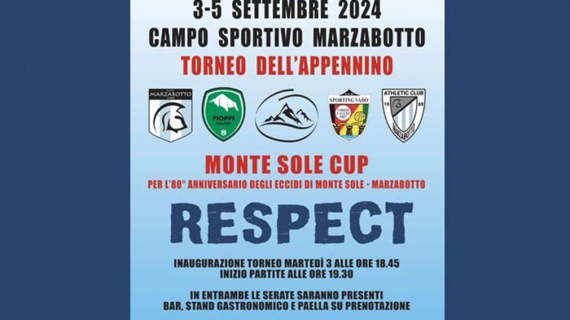 Nelle giornate di martedì 3 e giovedì 5 settembre si disputerà a Marzabotto il II° Torneo dell’Appennino “Monte Sole Cup”. Per la Commemorazione dell’ 80° anniversario degli eccidi di Monte Sole, il Comitato Regionale per le Onoranze ai caduti di Marzabotto ha sostenuto questo progetto di Memoria e sport, organizzato da ANPI Marzabotto, ASD Marzabotto 2000 e con la collaborazione di Athletic Club 1969, a cui parteciperanno anche la ASD Sporting Vado ed il Pioppe Calcio, con il Patrocinio del Comune di Marzabotto.