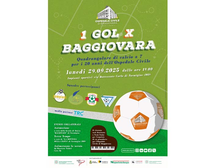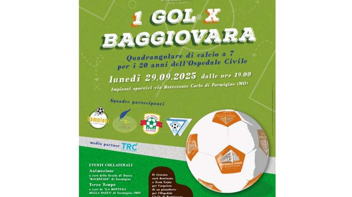Proseguono gli eventi organizzati dall’Azienda Ospedaliero – Universitaria di Modena per le celebrazioni dei 20 anni dell’Ospedale di Baggiovara. Lunedì prossimo, 29 settembre, dalle ore 19, l’Azienda in collaborazione con Team Enjoy Associazione Stampa Modenese ha organizzato Un gol X Baggiovara, quadrangolare di calcio a sette che si terrà a Corlo di Formigine (Modena) nei terreni da gioco della locale Polisportiva, in via Battezzate 70/72.