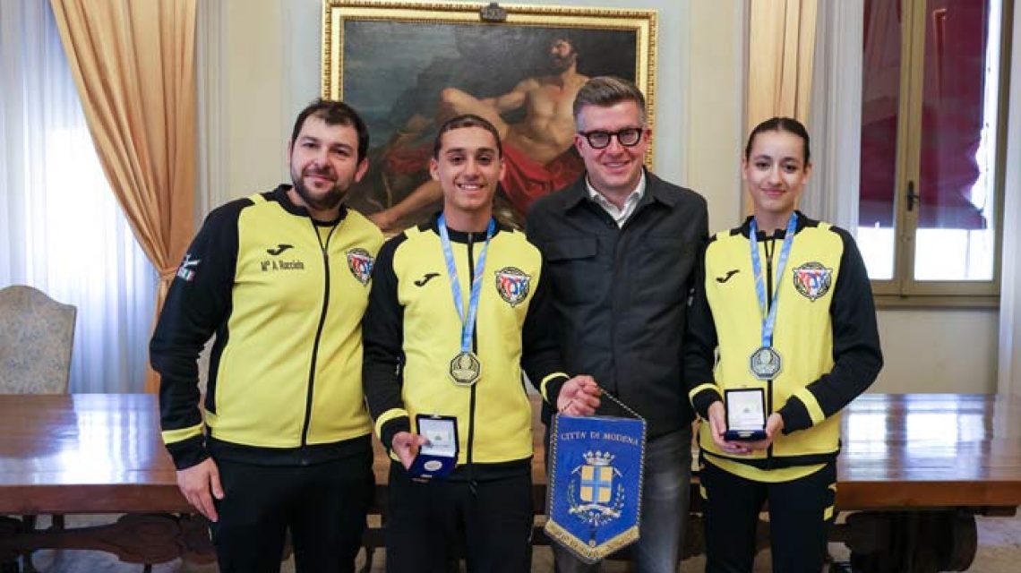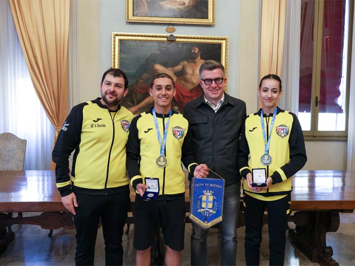 Nel corso dell’incontro, l’Amministrazione comunale ha consegnato ai due atleti una medaglia raffigurante “Il Grosso”, la prima moneta coniata dalla comunità modenese nel 1226, mentre alla società è stato donato il gagliardetto della Città di Modena.